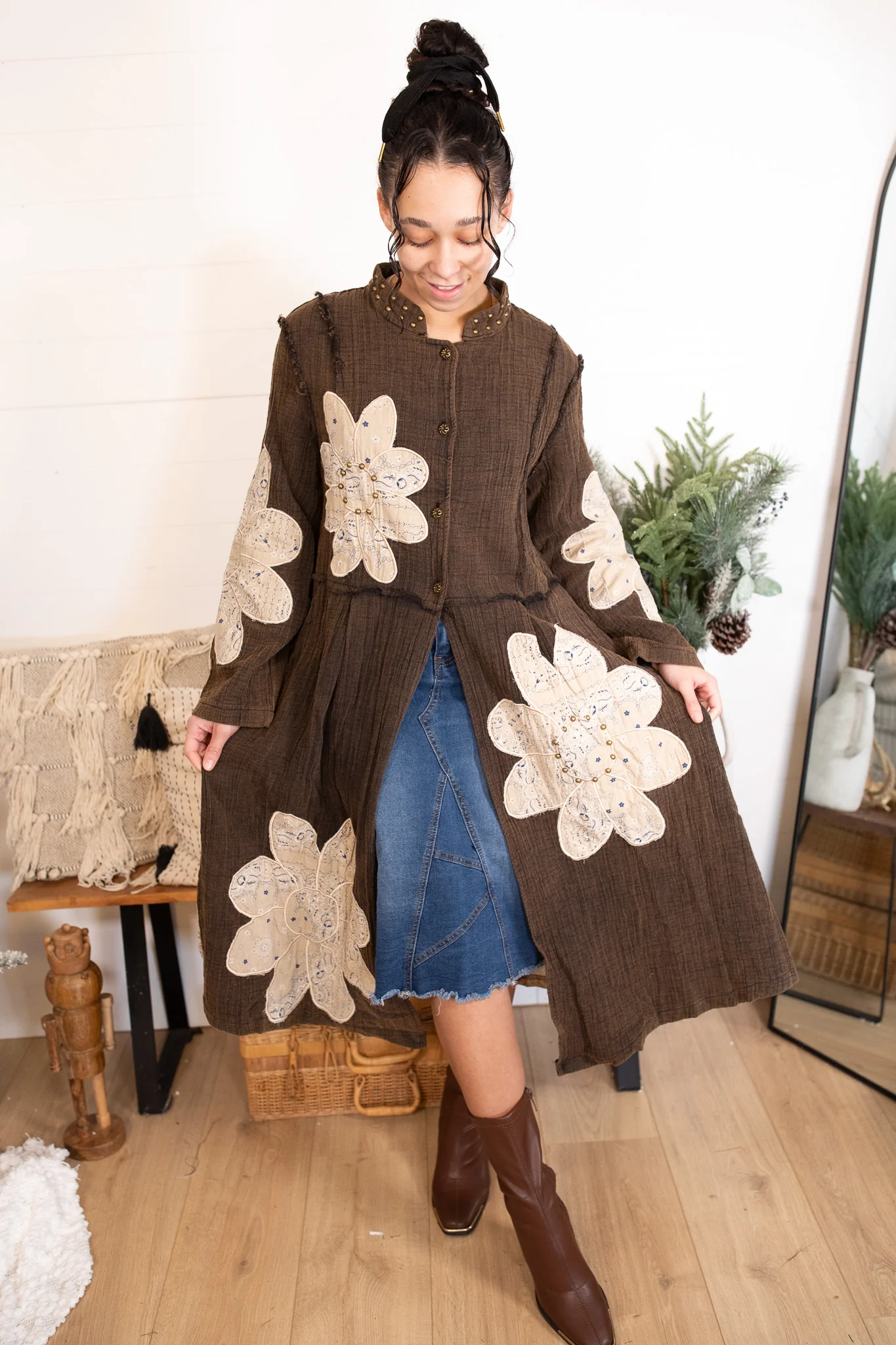 Designed with a relaxed, flowy silhouette, it layers beautifully over dresses or skirts for an effortlessly styled look. The lightweight feel makes it perfect for transitional seasons, while the detailed embroidery and unique patch placement make every jacket feel special and one-of-a-kind.