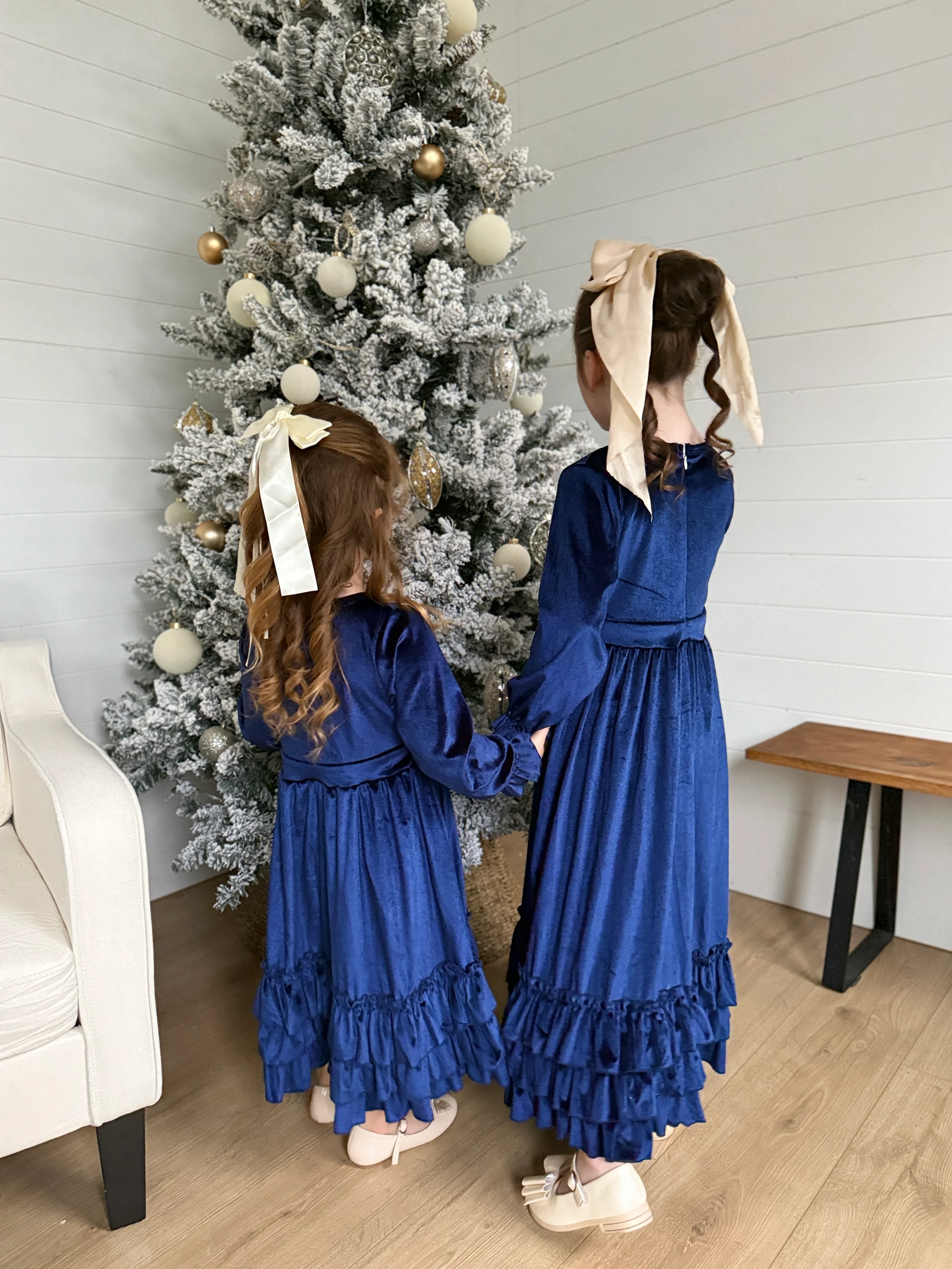 The Girl's Enchanted Christmas dress features a popular style from last year and new holiday colors. The stretchy velvet fabric and triple ruffle hem add comfort and flow, with a zip-up back for easy wear. Its versatile design makes it perfect for any occasion, and a matching ladies' version is also available for a coordinated look.