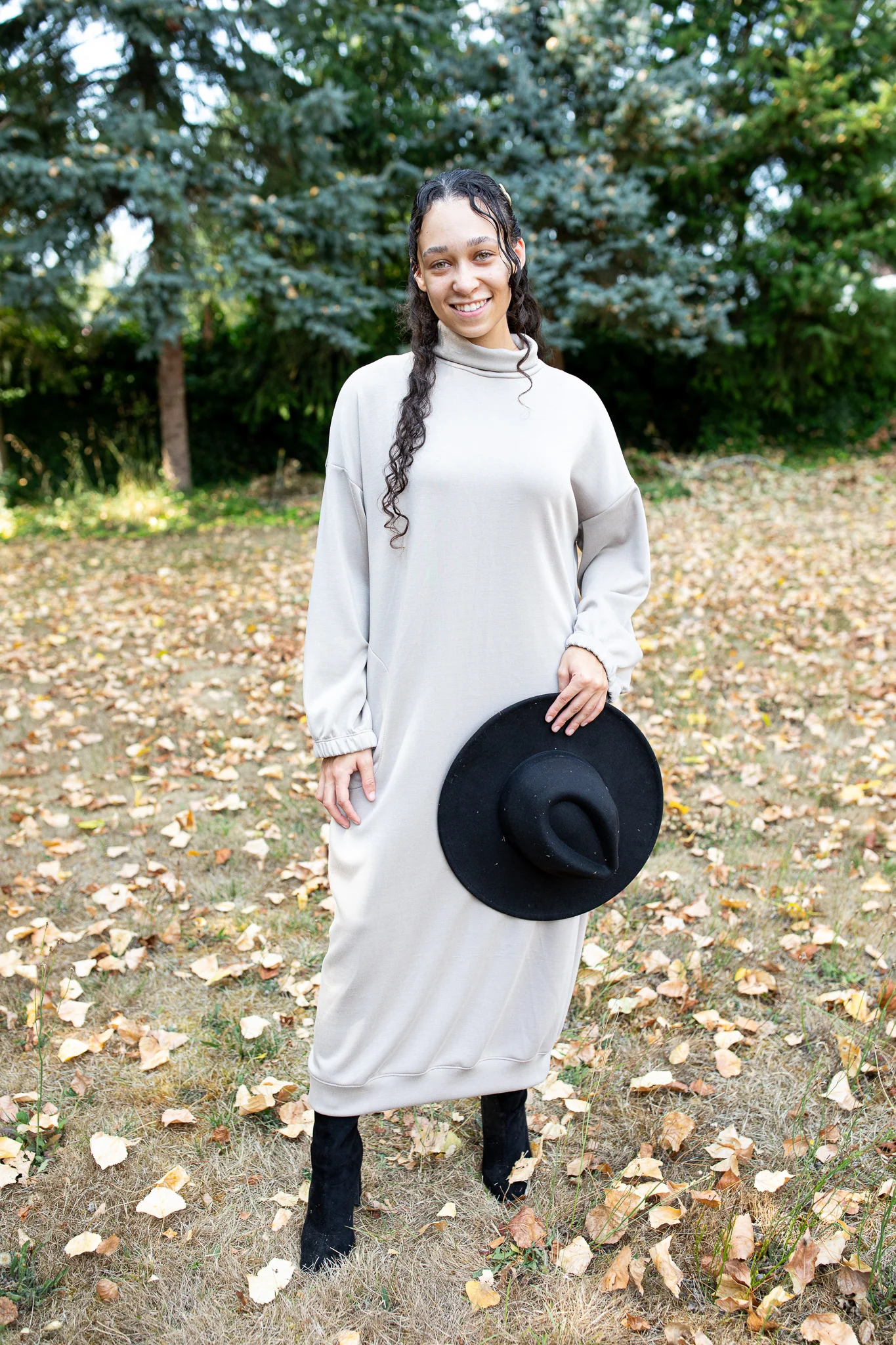 Wrap yourself in understated elegance with our Lounge Luxe Dress. Crafted from a smooth, medium-weight fabric that feels as luxurious as it looks, this oversized silhouette is designed for effortless comfort. Featuring a turtleneck, relaxed sleeves with subtle elastic cuffs, and cute front pockets, it's your go-to piece for chic lounging or casual outings. The draped shape offers a refined yet relaxed look that transitions seamlessly into cooler seasons.