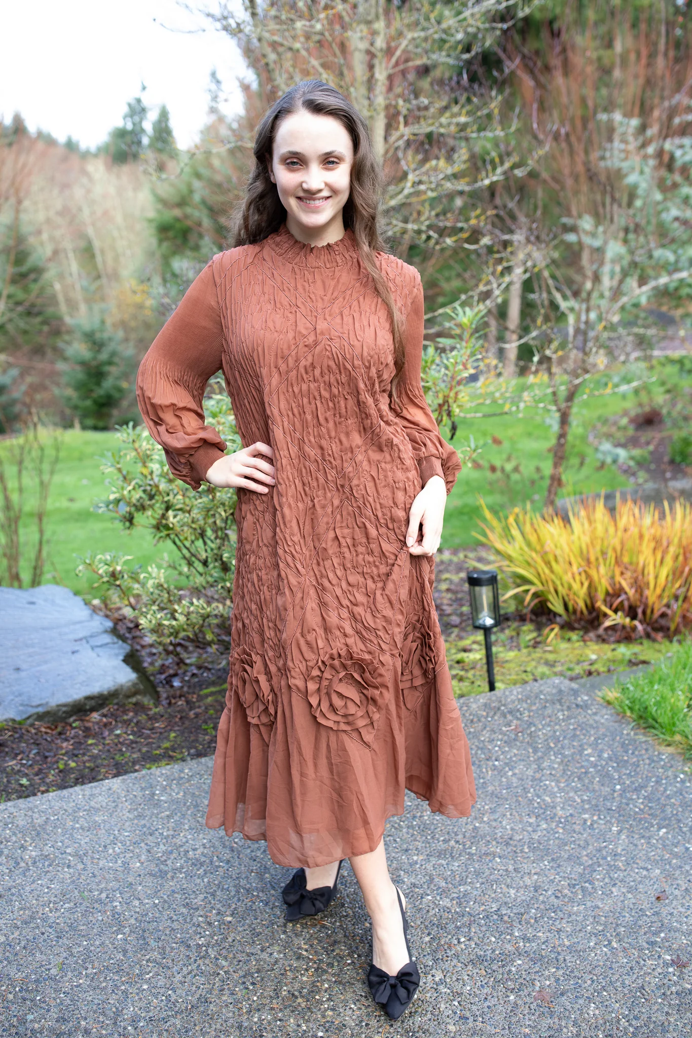 Elegant, embroidered, and effortlessly statement-making — this one-size dress is a true showstopper. Designed with the same luxurious textured embroidery you loved, this version features three stunning dimensional roses along the hem for an extra touch of romance. The silhouette flows beautifully with plenty of room and movement, making it comfortable while still incredibly elevated. A soft lining ensures smooth wear, while the lightweight sheer outer layer creates a dreamy, ethereal drape. This one-size style fits beautifully through a few sizes — but as always, please check the measurements to ensure the perfect fit. A standout piece for holidays, special events, and every moment you want to feel unforgettable.